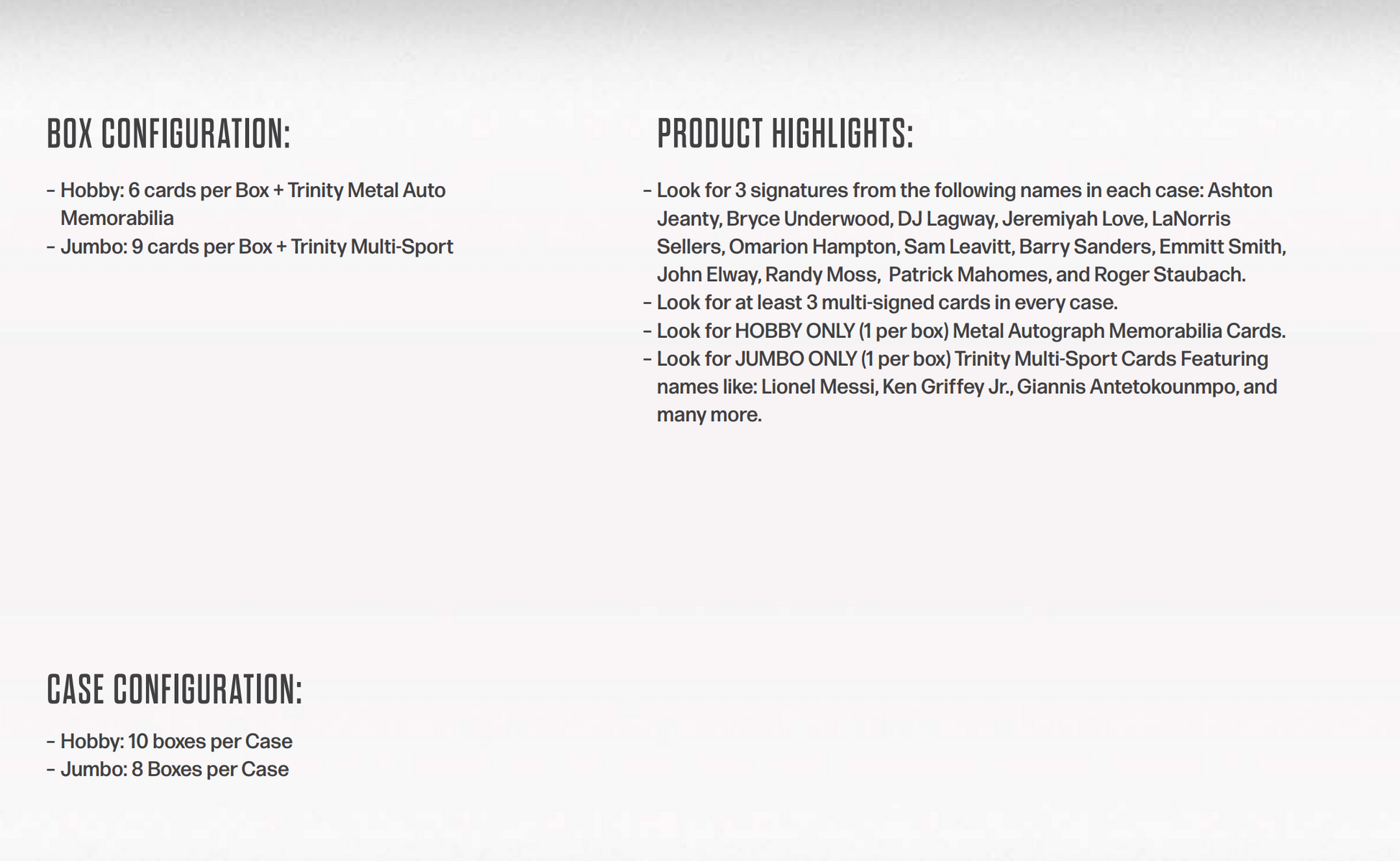 Specs: 6 cards per box including 1 Trinity Metal Auto Memorabilia