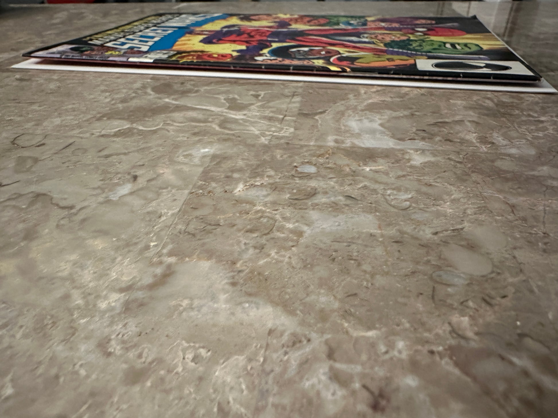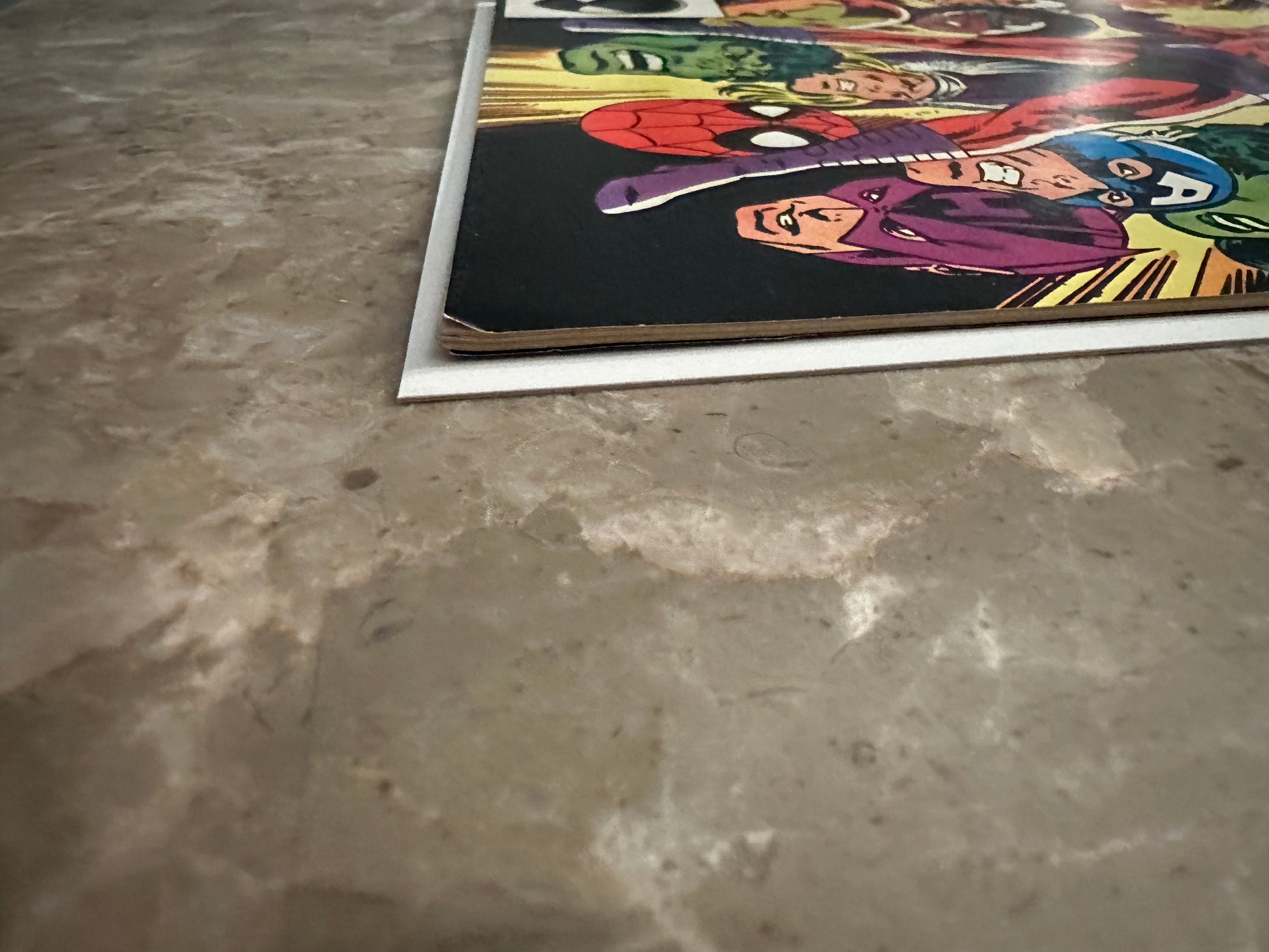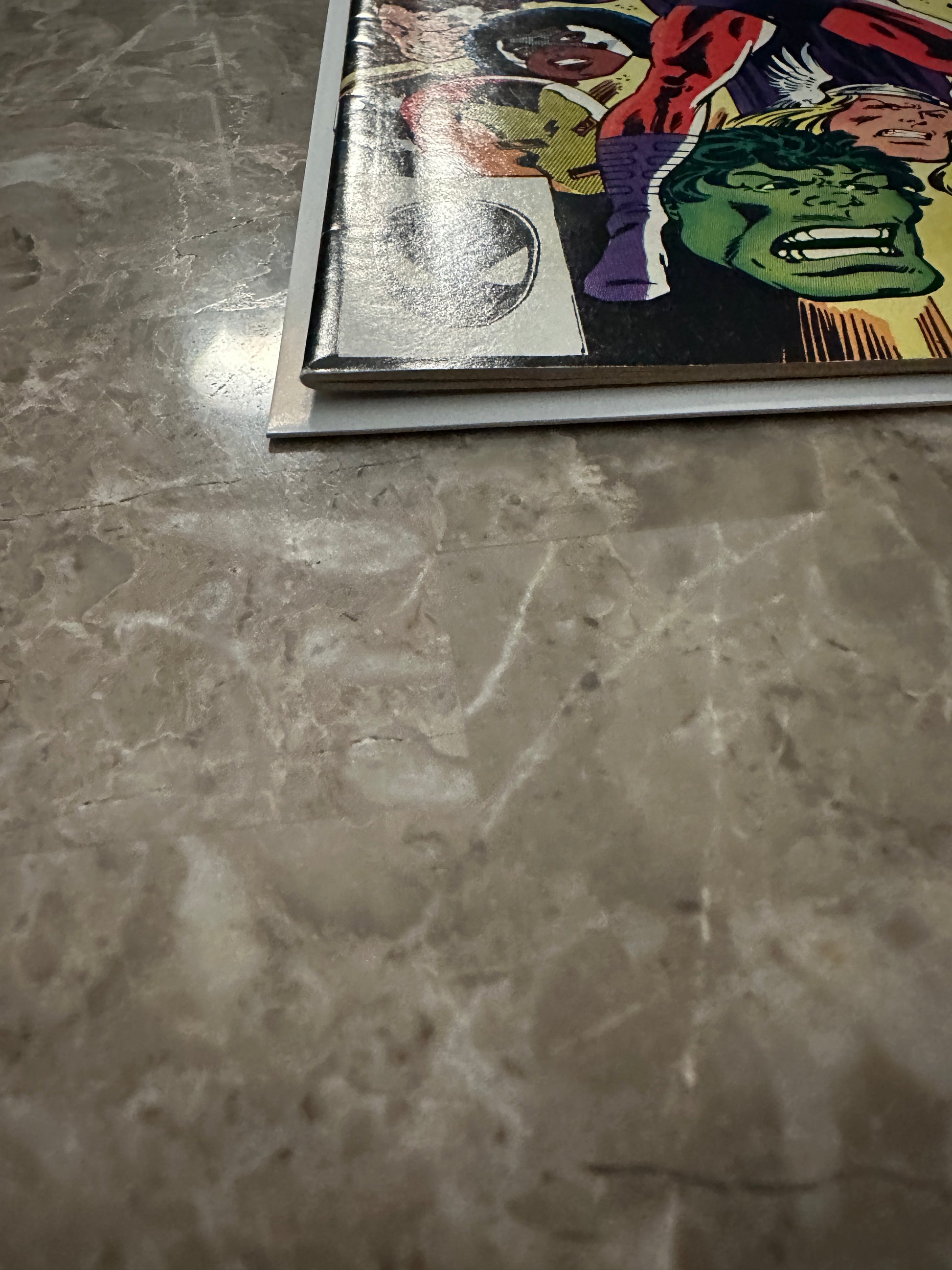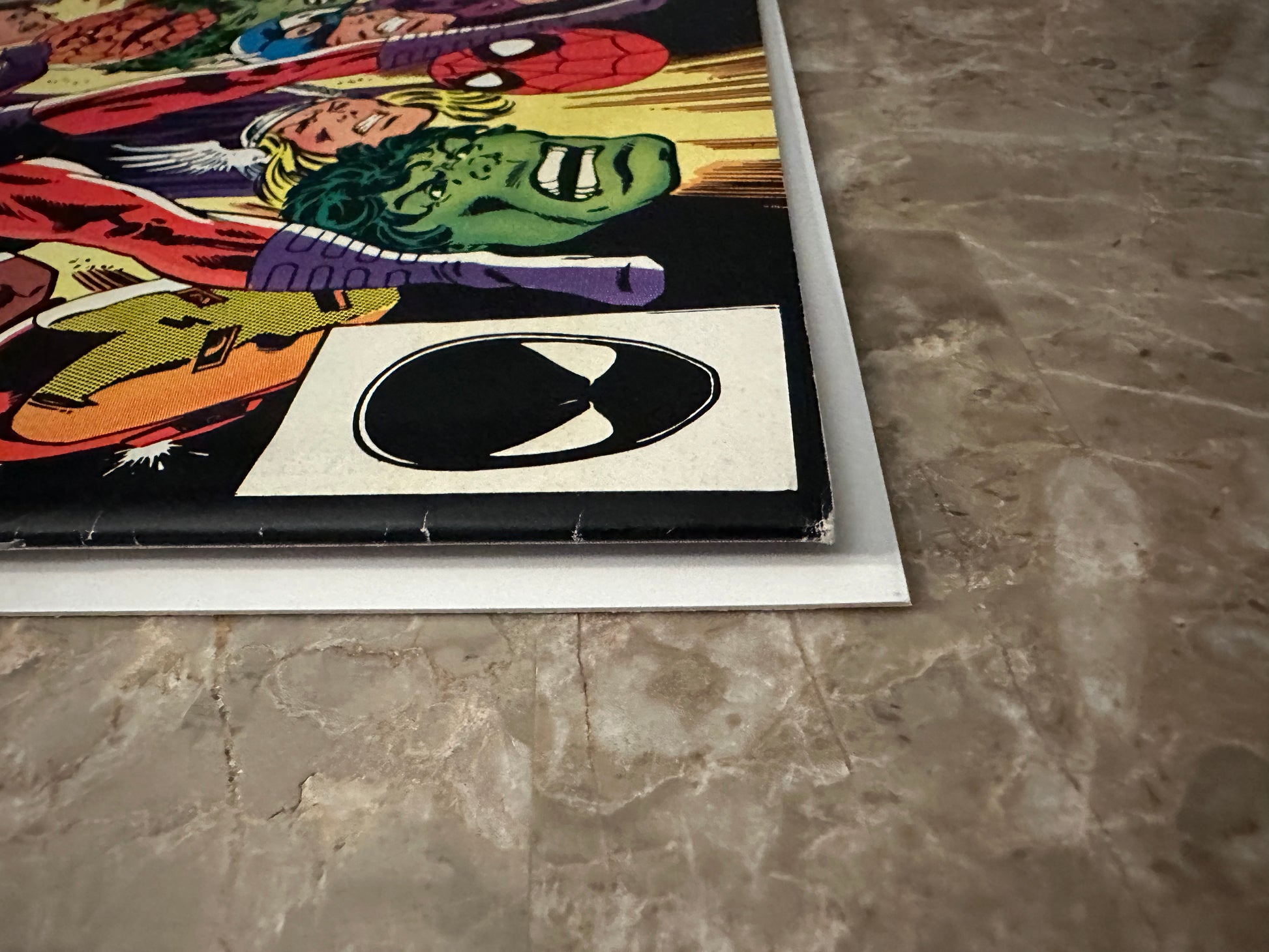 Medium denting on the covers. Light bending to left edge of the back cover. Color breaking crease to lower right corner of the front cover. |